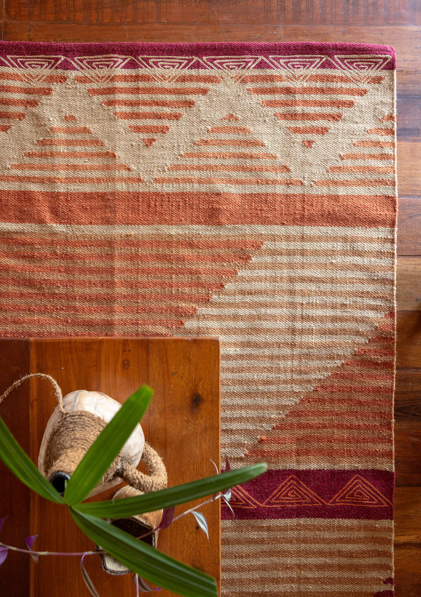 - A wonderful rug with a graphic pattern design of chevrons and stripes, creating a simultaneously classic and modern look. Woven using the kilim technique in a durable wool with a cotton warp. Decorated with cheerful embroidery in cotton.Size and Measurement