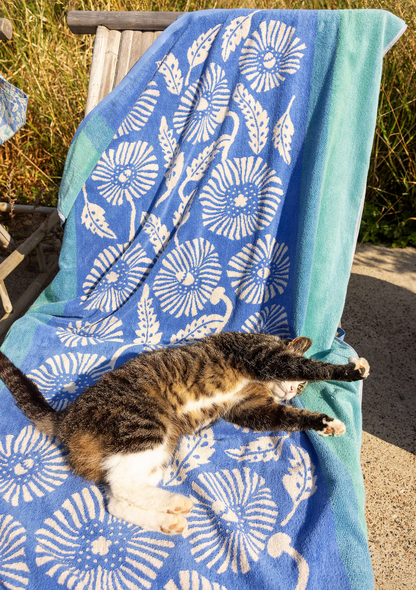 - A generously sized bath sheet, with flowers and striped sides in harmonious colors. Soft and comfy terry with excellent absorbency. Contrasting color at the edge and hangers on the short and long sides.Size and Measurement