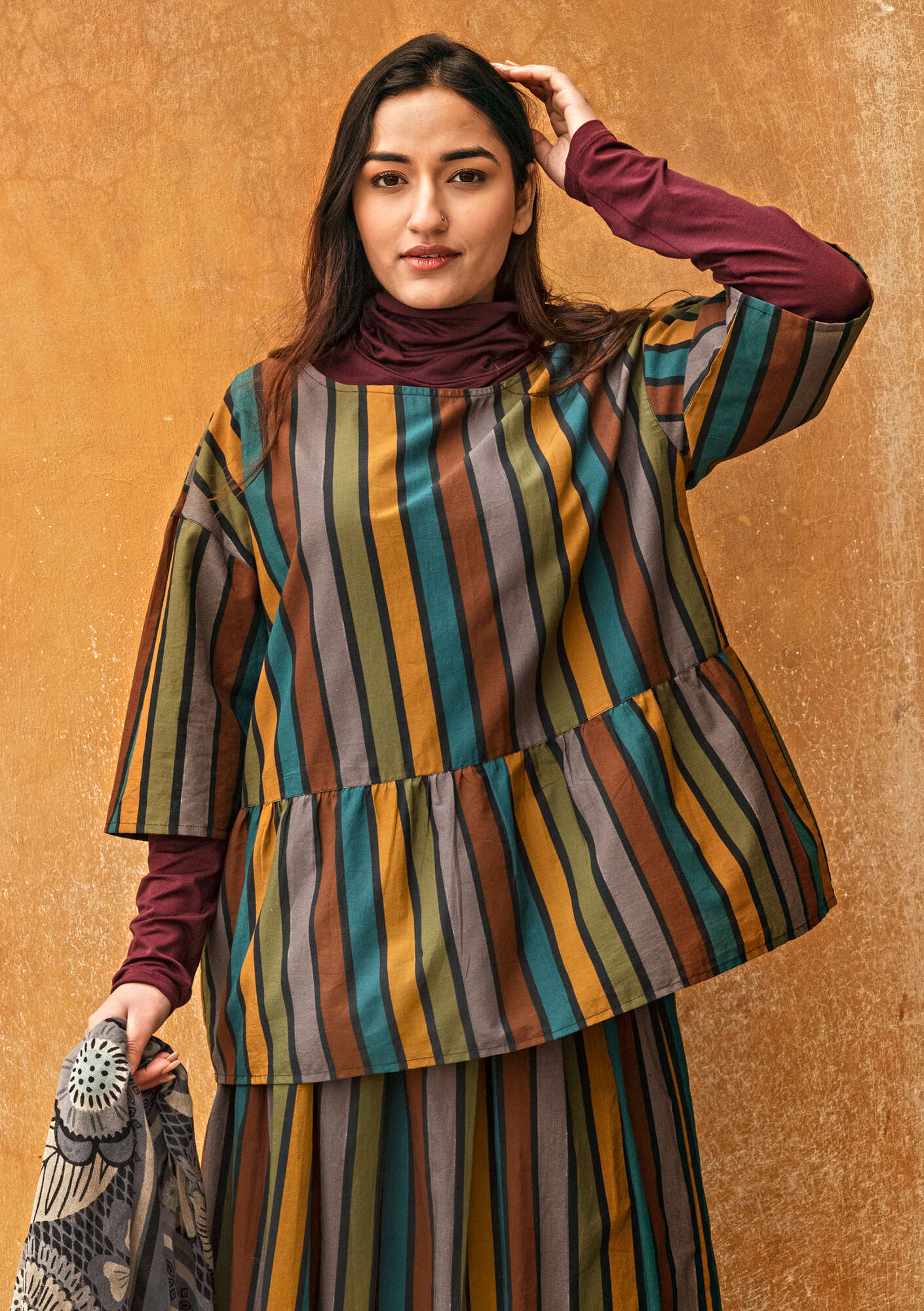 - Digitally printed blouse with a ruffle at the lower edge. Subtle boat neck. Half-length sleeves and mother-of-pearl button closure on one shoulder. Gathered seam at the waist, creating a touch of volume below.Size and Measurement