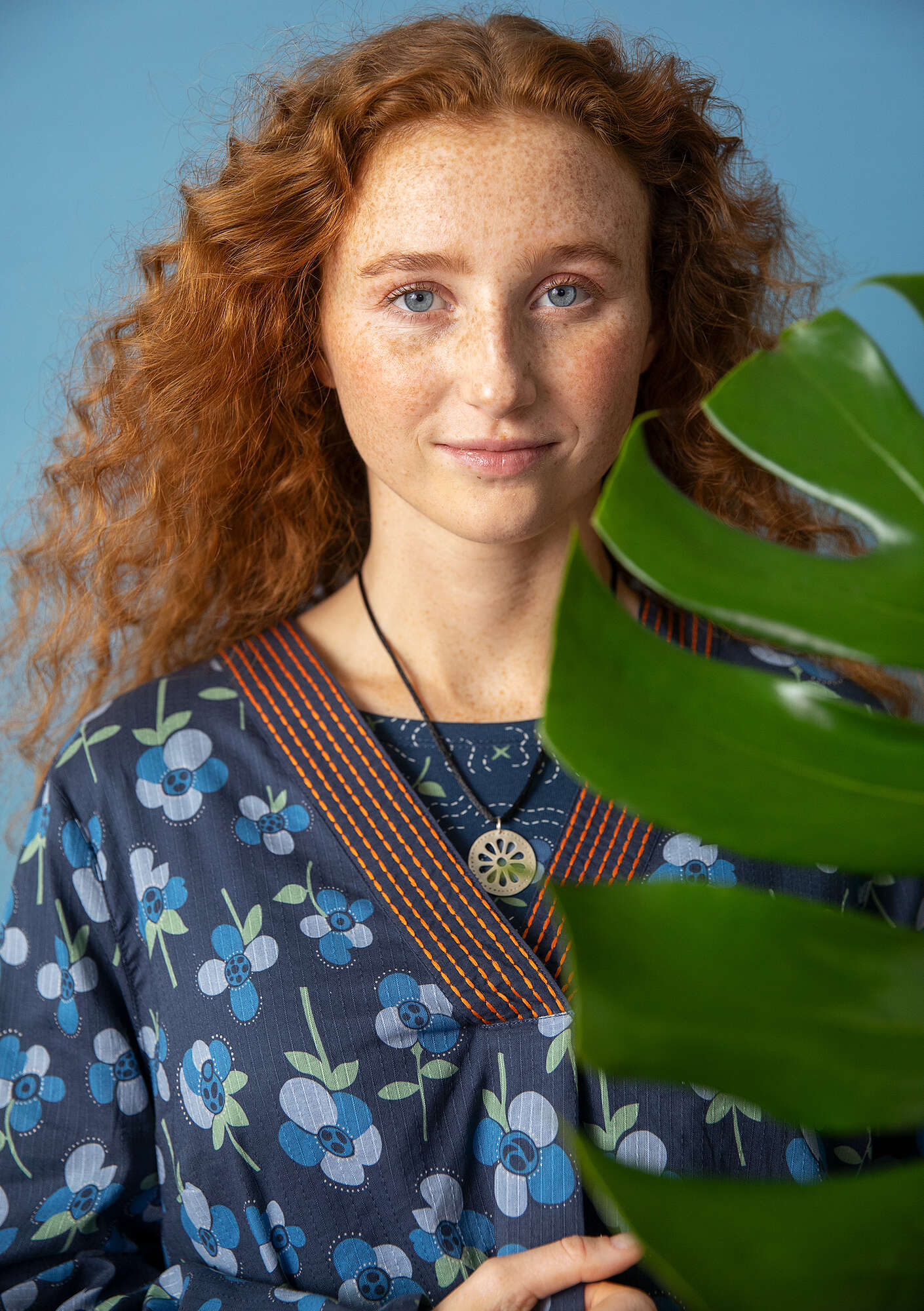 - 100% cotton. The cotton is certified organic. The garment is digitally printed and the print is certified. Machine wash warm, delicate cycle. Medium iron. Shrinkage 2-3%. Made in Faridabad, India.