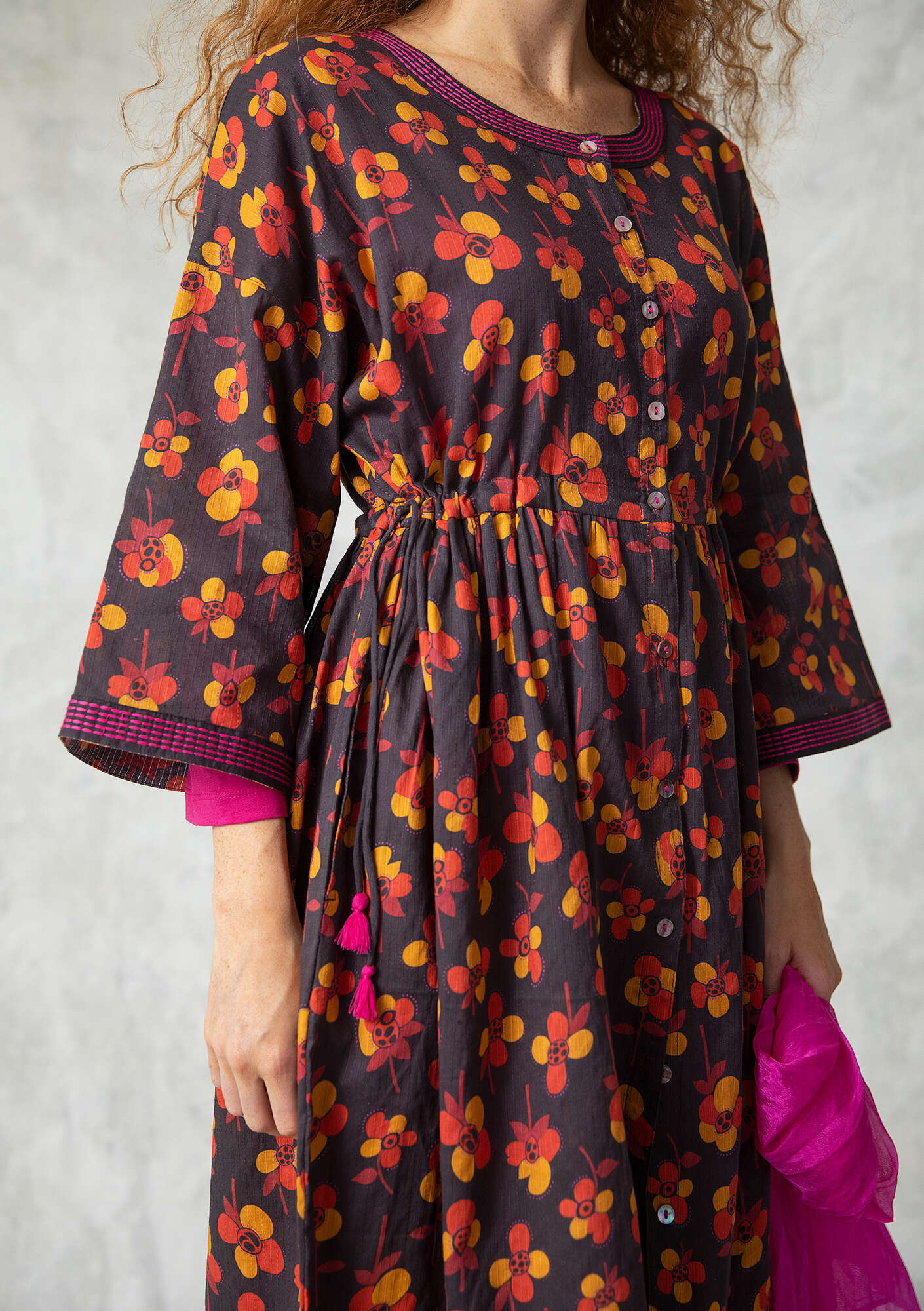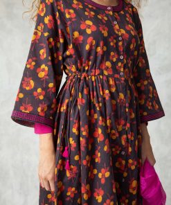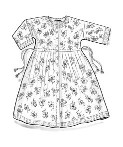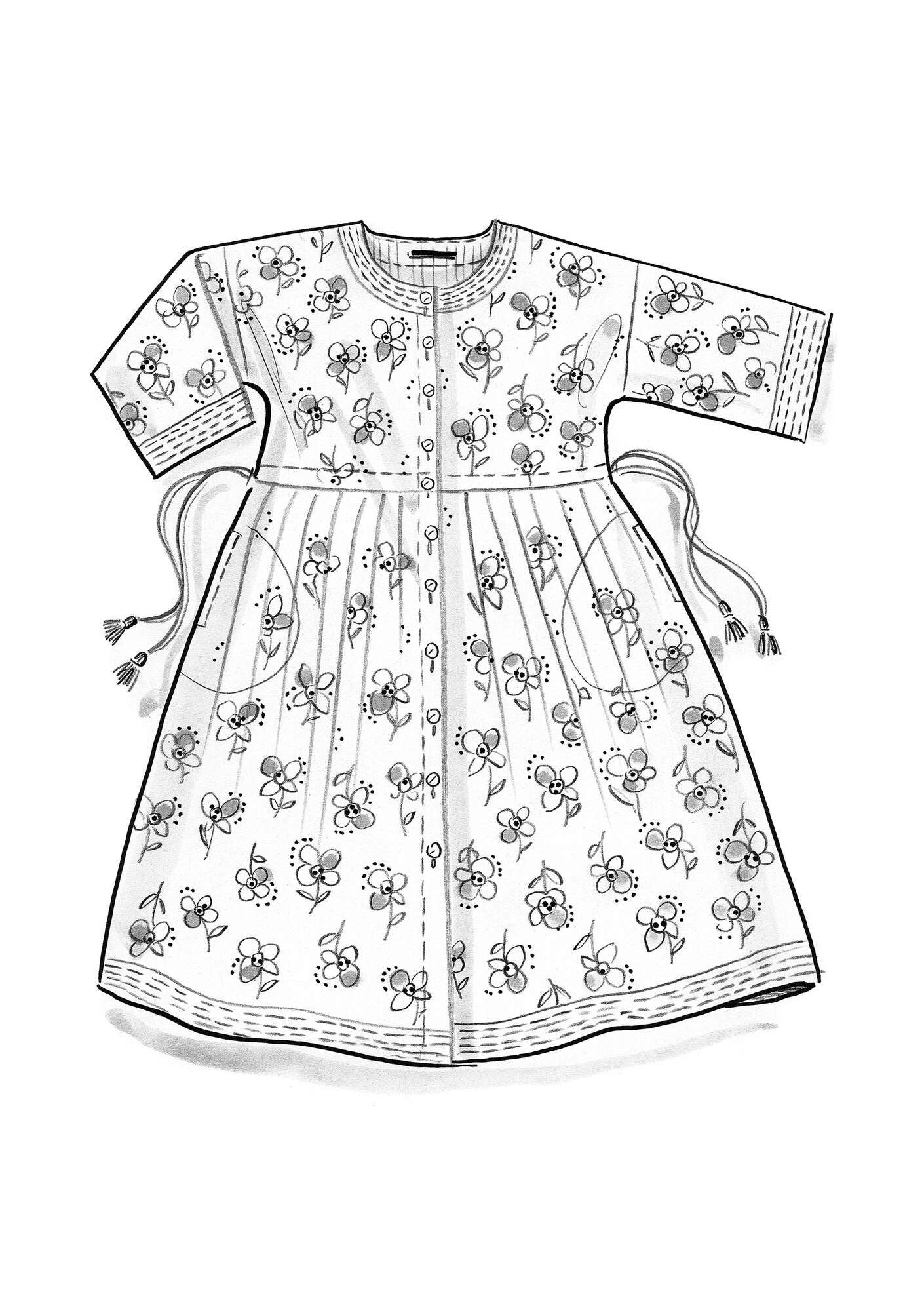 - Digitally printed dress in a fully buttoned style. Dropped shoulders and slightly shorter than three-quarter sleeves. Gathered seam at the waist for more volume in the skirt. Drawstring and double ties finished with small tassels in an accent color. Embroidery in an accent color at the neck, cuffs, hem and side pockets.Size and Measurement