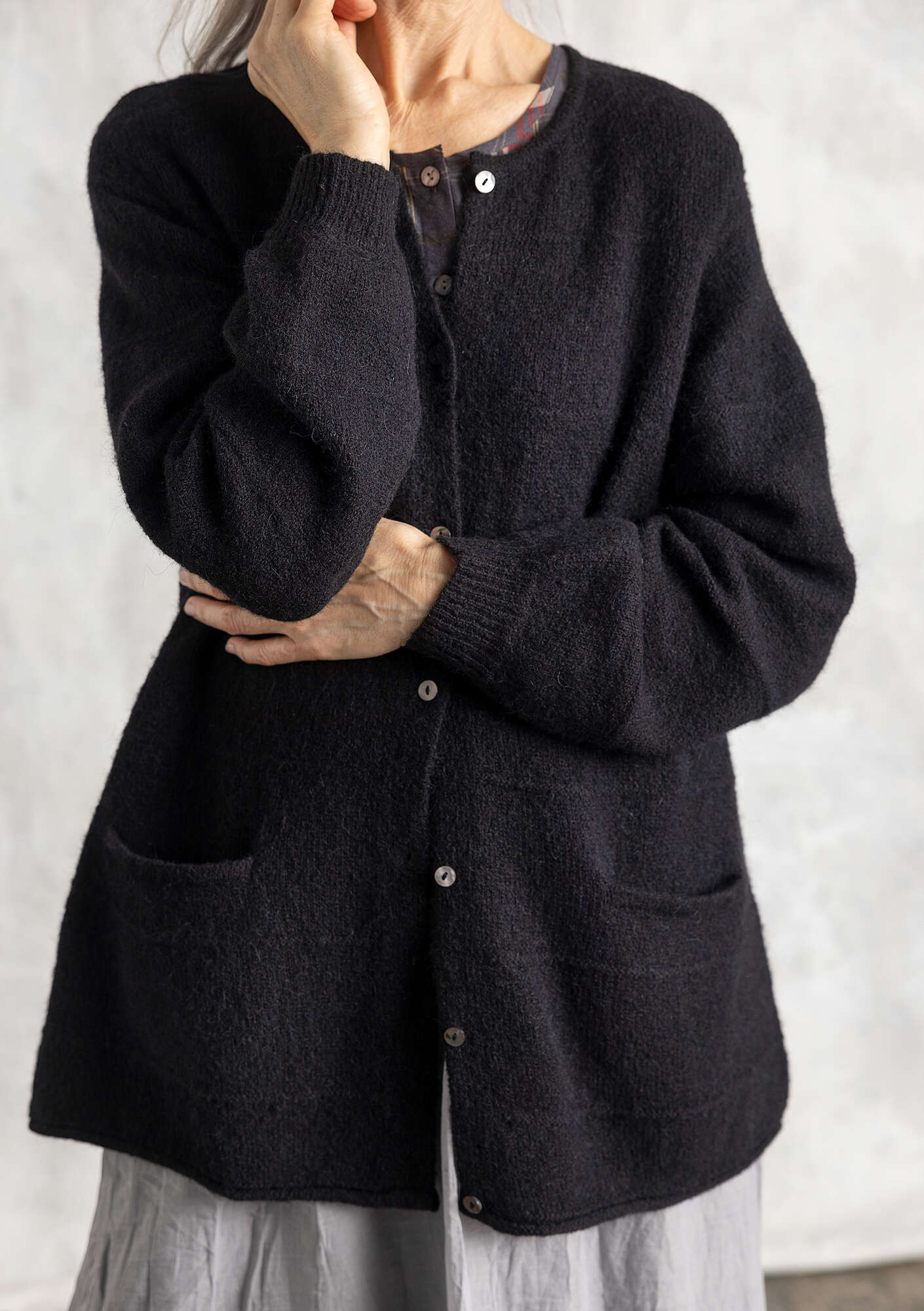 - Solid-colored cardigan with simple, textured-knit stripes. A-line and slightly longer style. Long, elegant puff sleeves with elastic cuffs. Mother-of-pearl buttons and pockets.Size and Measurement