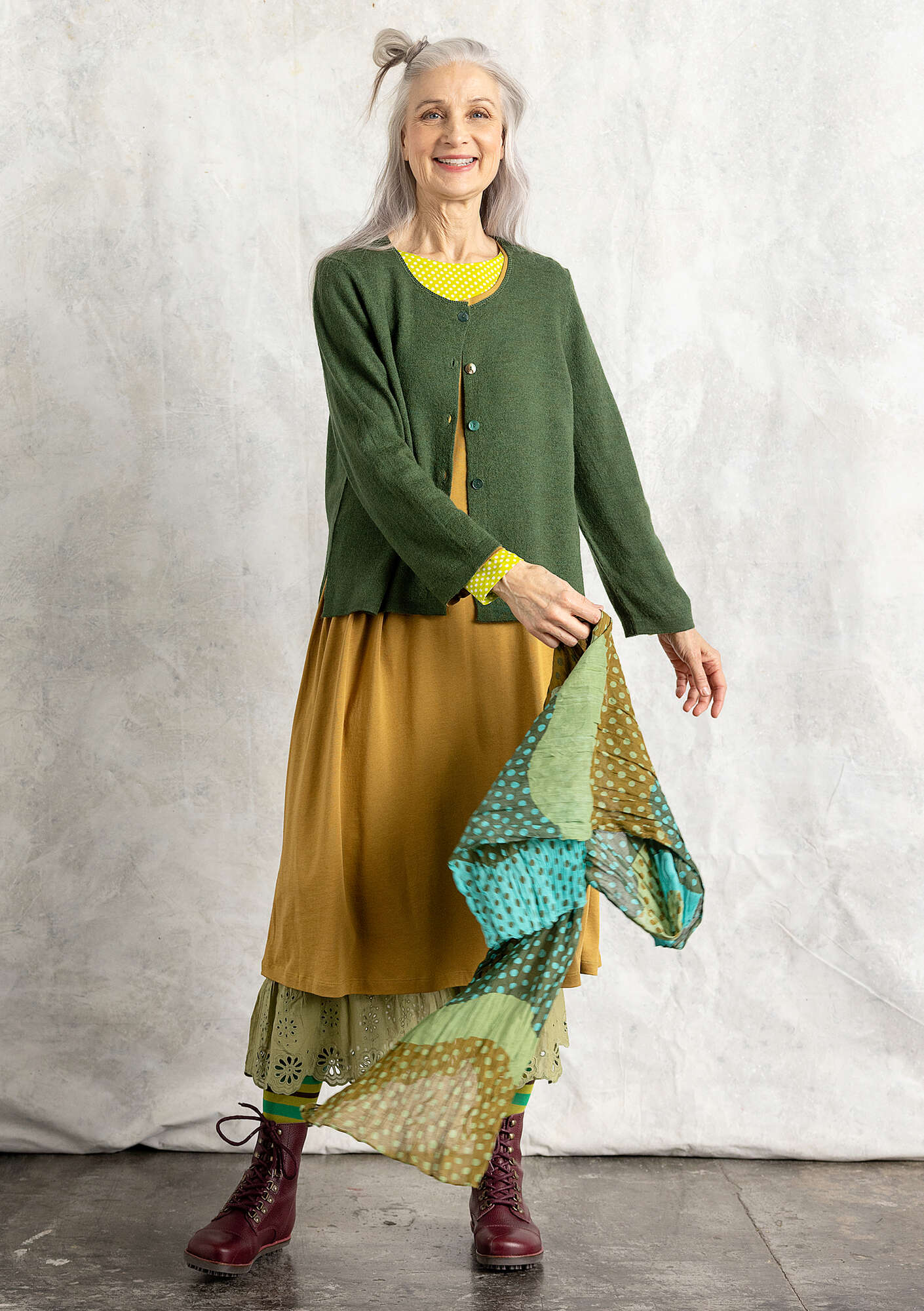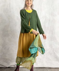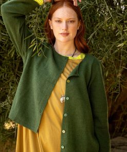 - Short, straight-cut style with small slits at sides. Pretty hand-crocheted edge at the neckline. Mother-of-pearl buttons dyed in three similar shades, which are varied on the cardigan.Size and Measurement