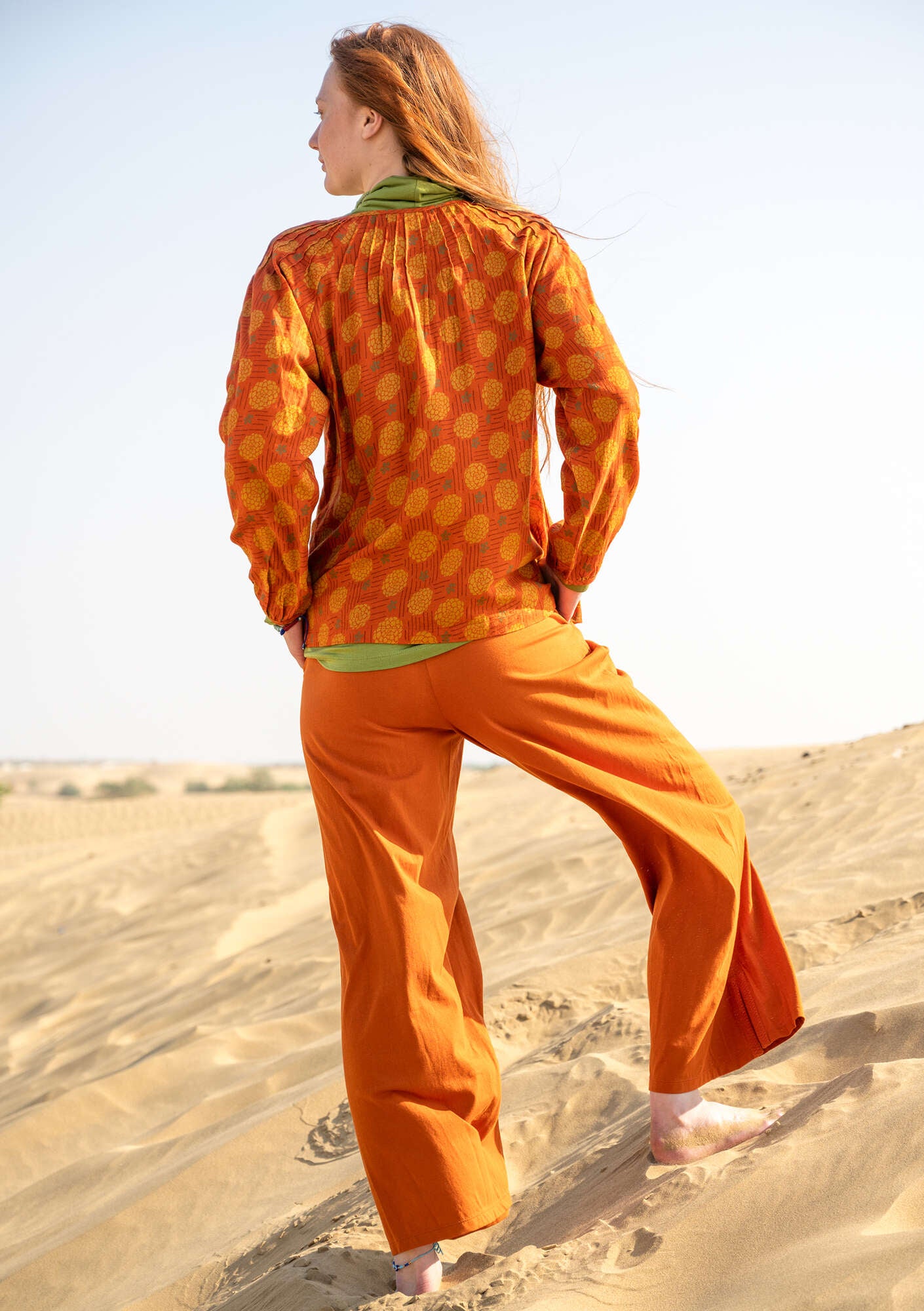 - 100% cotton. The cotton is certified organic. The entire production chain is certified. Machine wash cold, delicate cycle. Stretch gently to length while damp. Do not tumble dry. Shrinkage 3-4%. Made in Delhi, India.