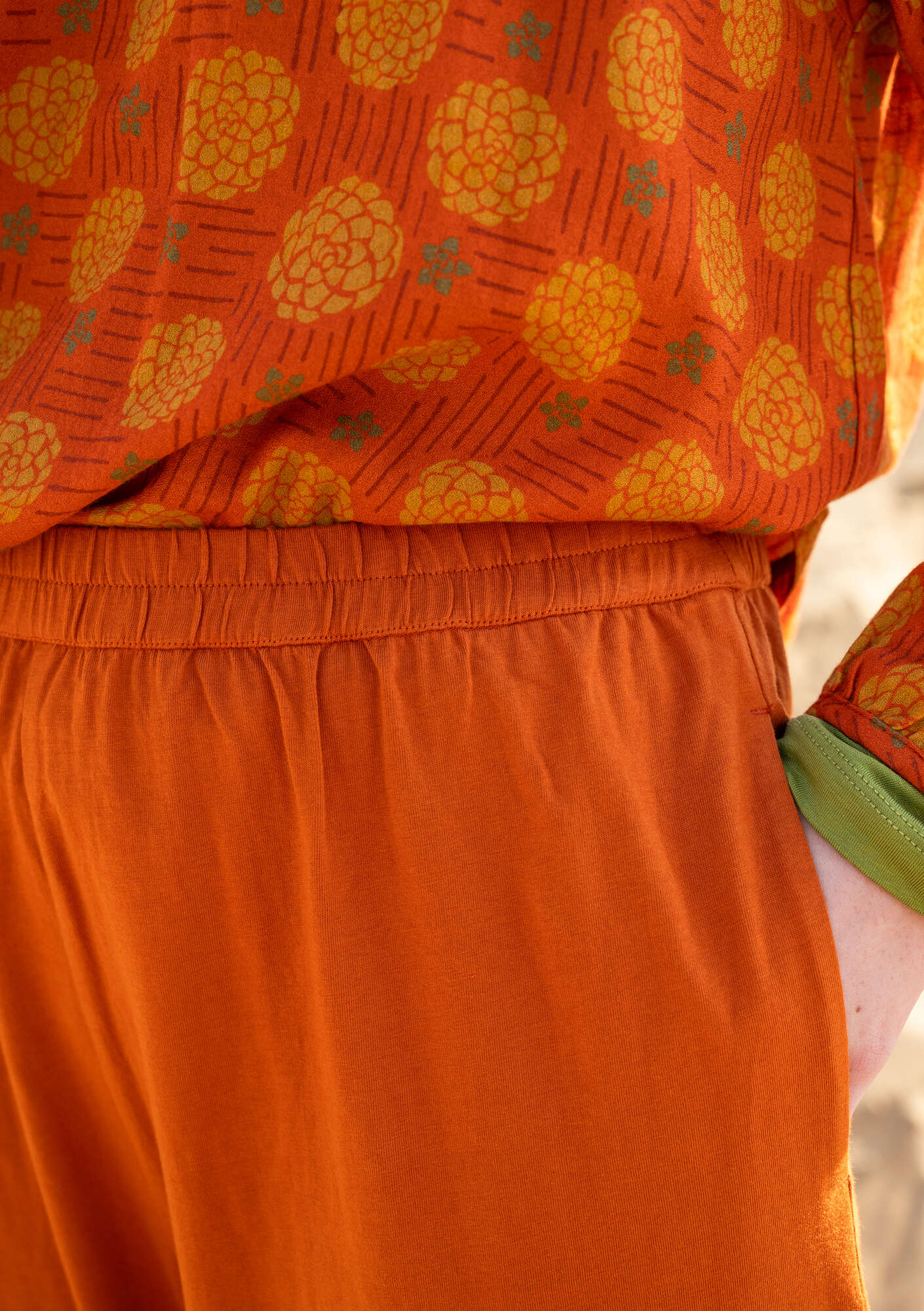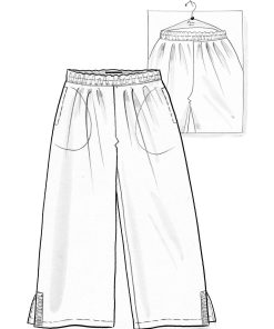 - Solid-colored jersey pants with a bit of width. Elastic waistband and side pockets. Slits with embroidered edges for a decorative detail.Size and Measurement