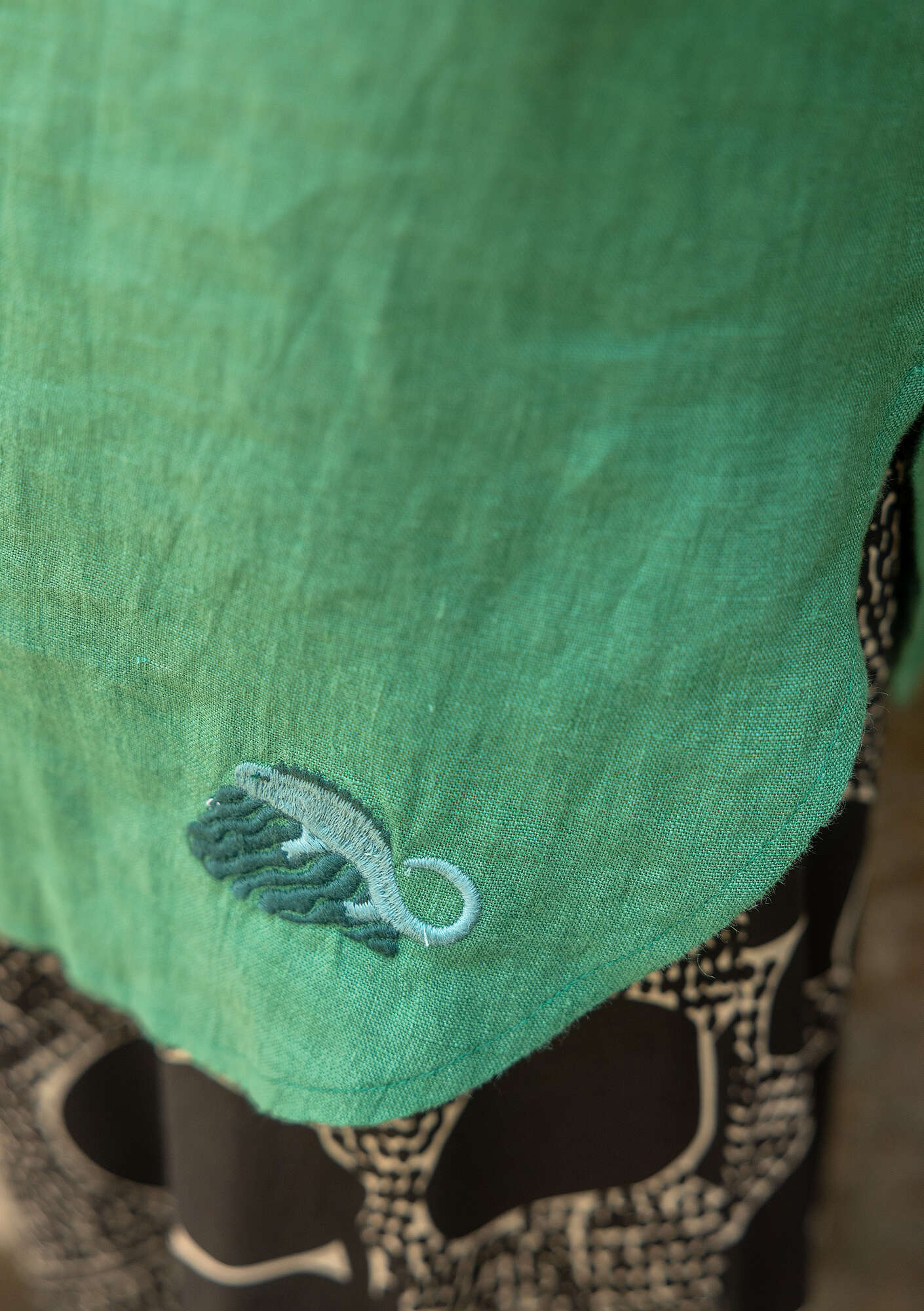 - Shirt tunic with a seam on the front and a rounded hem. Shirt collar and a yoke at the front and back, with a small box pleat for extra width. Long sleeves with cuffs and double buttons for small adjustments. Metal buttons with accent-colored thread. Different animals, depending on colorway, are embroidered at the lower edge of the garment.Size and Measurement