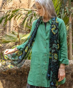 - 100% linen. The linen is dew-retted, a natural process in which the sun and dew handle the work without chemicals and with minimal water use. The entire production chain is certified. Machine wash warm, delicate cycle. Medium iron. Shrinkage 2-3%. Made in Kundli, India.