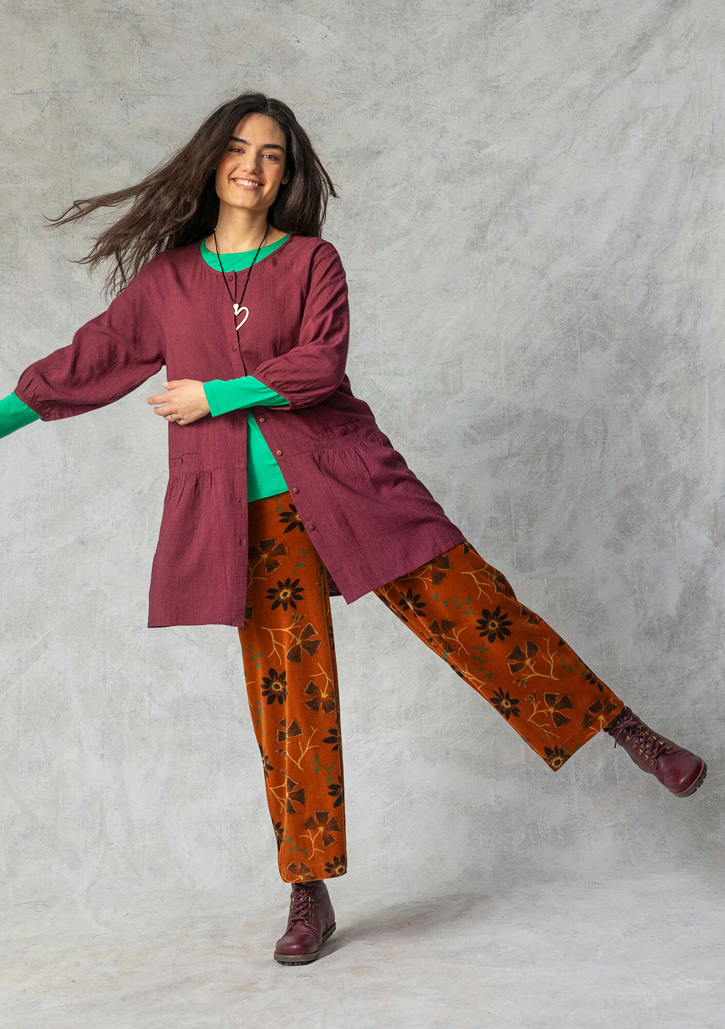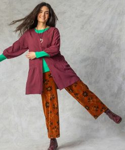 - 80% cotton/20% polyester. The cotton is certified organic. The polyester is recycled. The dyeing process and print are certified. Machine wash warm, delicate cycle. For best results, we recommend tumble-drying in order for the velour to retain its softness and sheen after washing. It is sufficient to run it in the dryer briefly on low heat and then to hang the garment on a hanger to dry completely. Shrinkage 2-3%. Made in Sandanski, Bulgaria.