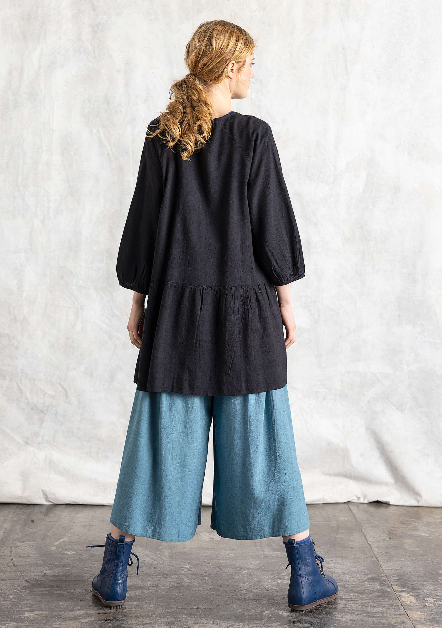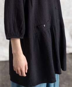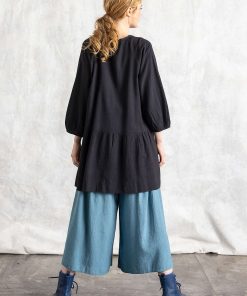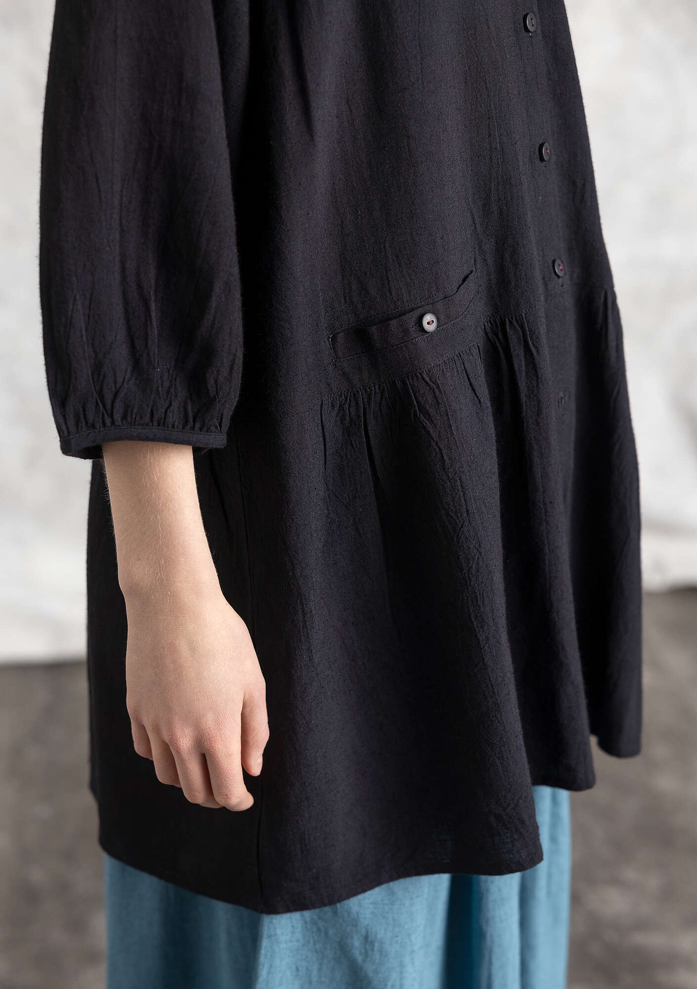 - Fully buttoned blouse with raglan puff sleeves. A lower tier gives this garment flattering width. Welt pockets with a button at the front. This fabric has an especially beautiful drape. Matte, dyed buttons.Size and Measurement