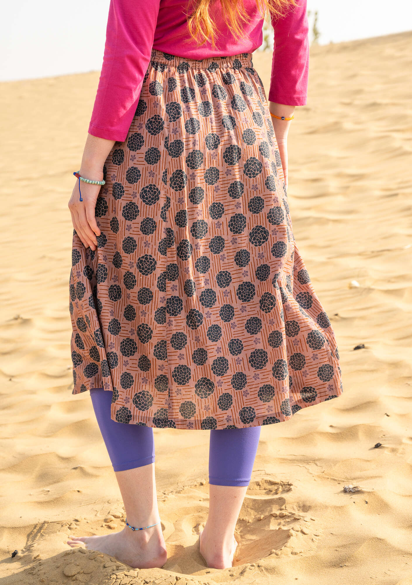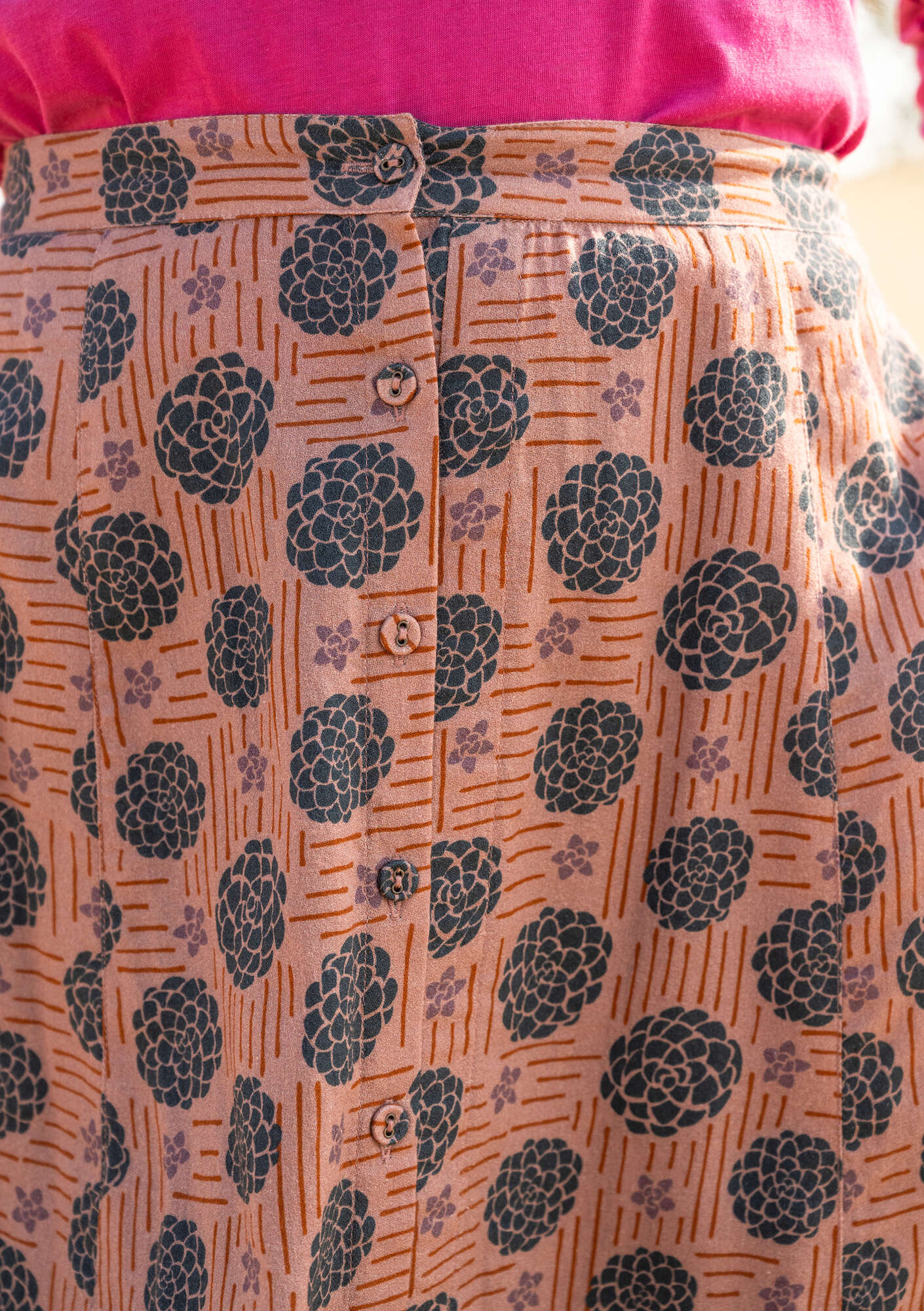 - Printed and fully buttoned skirt, sewn in panels. Waistband with elastic at the back and covered buttons.Size and Measurement