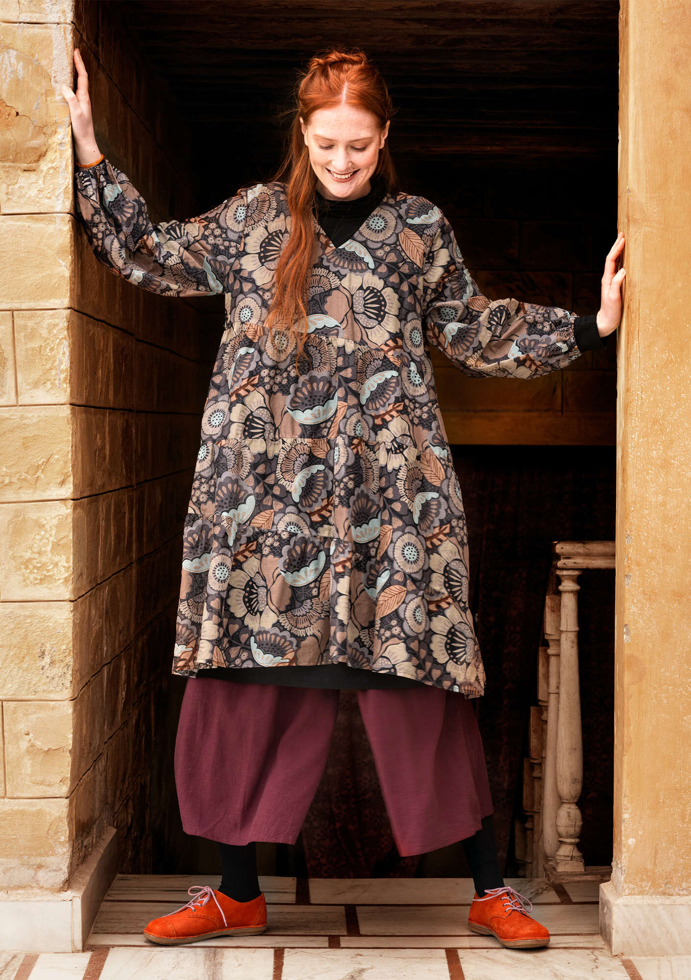 - Digitally printed dress in an exciting style. Constructed in diagonally cut panels, with the fabric direction placed on an angle. V-neck and long puff sleeves with elastic at the cuffs. Pockets at the side seams.Size and Measurement