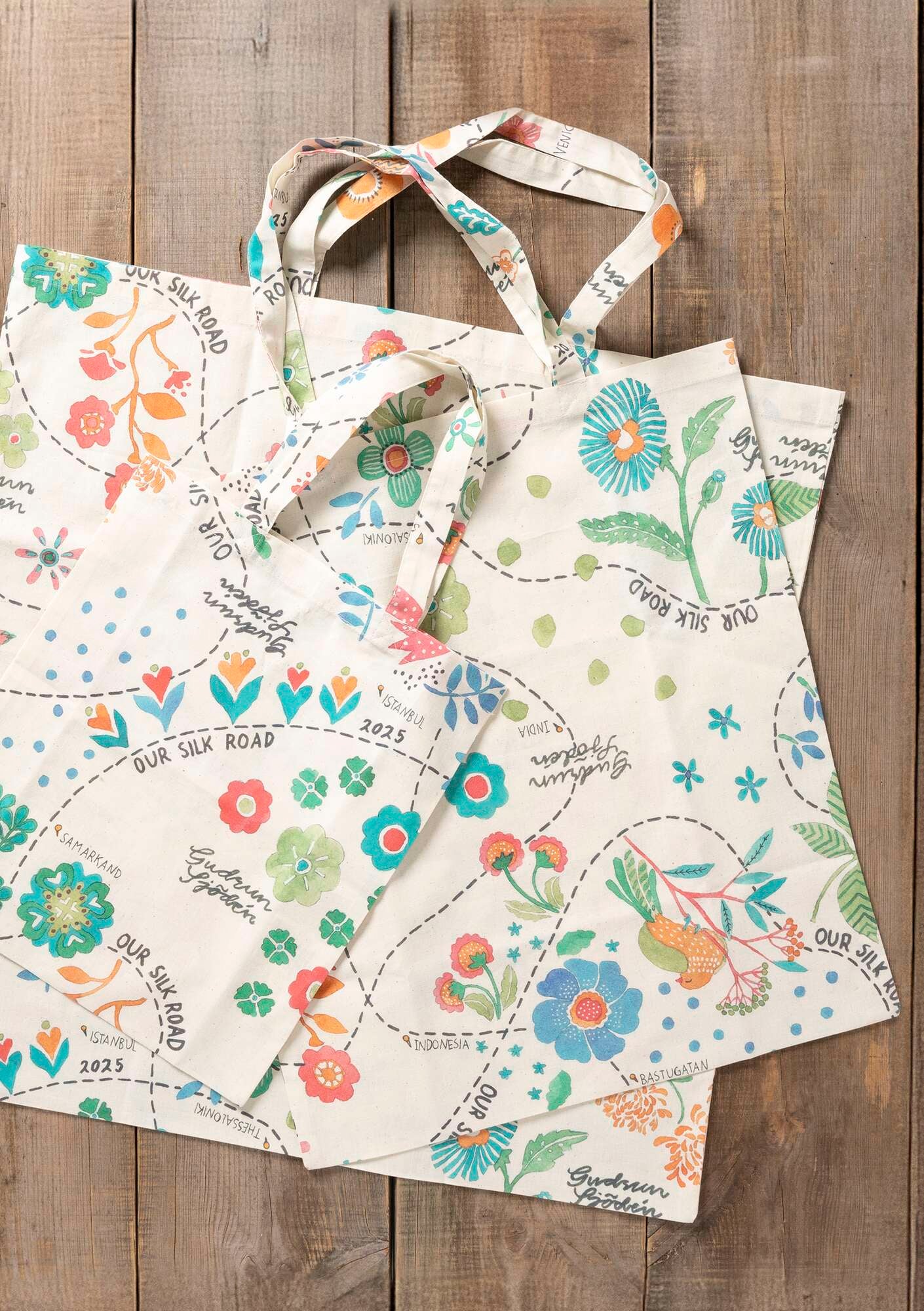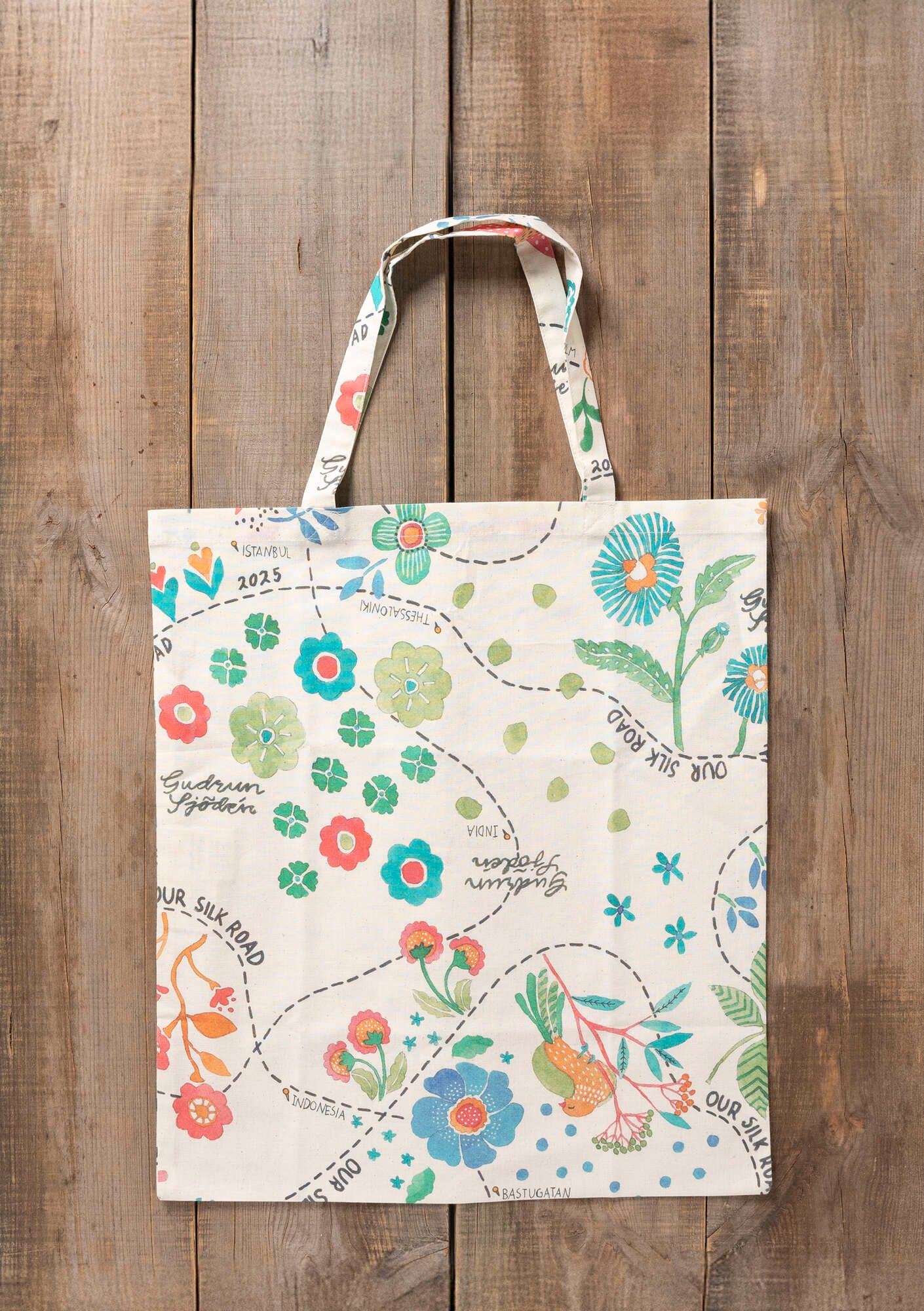 - Our beautiful fabric tote bag in a dazzling medley of this season’s patterns. Square style, with two handles.Size and Measurement