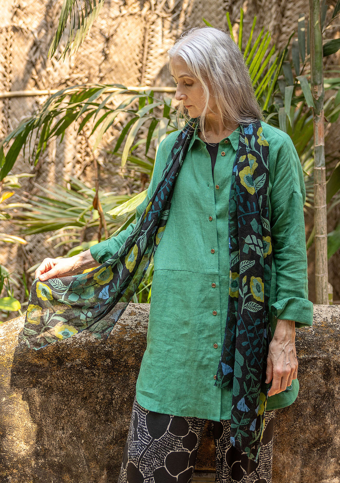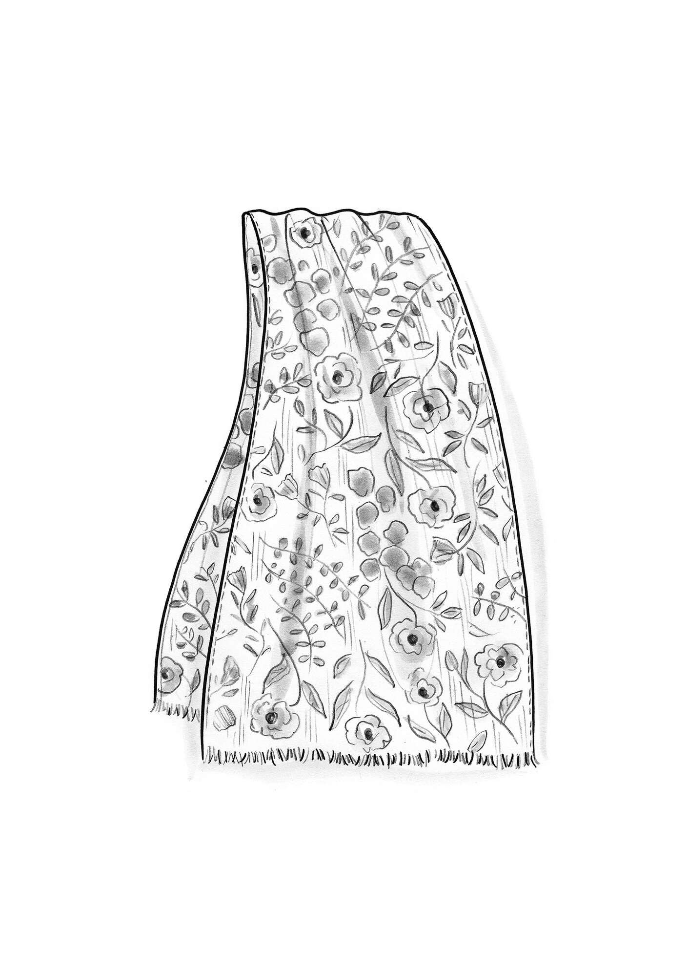 - Screen-printed wool shawl. Long side hemmed with thread in a contrasting color and an unhemmed short side, which creates short, natural fringe.Size and Measurement